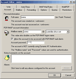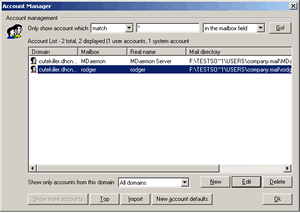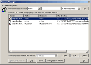 要添加更多邮件账户,请选择菜单“Accounts/Account Manager...” 在账户管理器界面中,点击“New” 在“Account”标签页面中,完成以下设置: Full name: 填入新用户的名称 Mailbox name: 填入新用户的邮件地址前缀 Account password: 填入新用户的邮件口令 点击“OK”保存